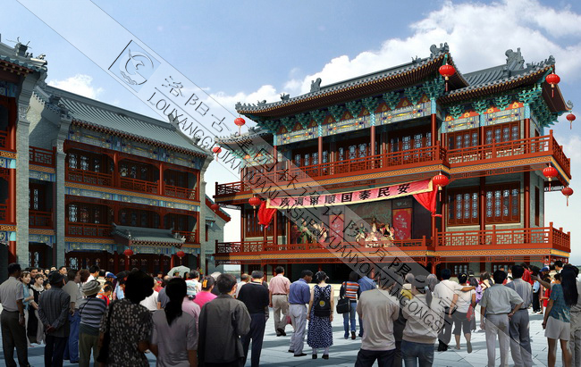 祭城古街自北向南設(shè)計了四個段落分區(qū),分別為“祭城掠影”,“歌舞升平”,“鼓樓鐘聲”和“古城遺韻”。